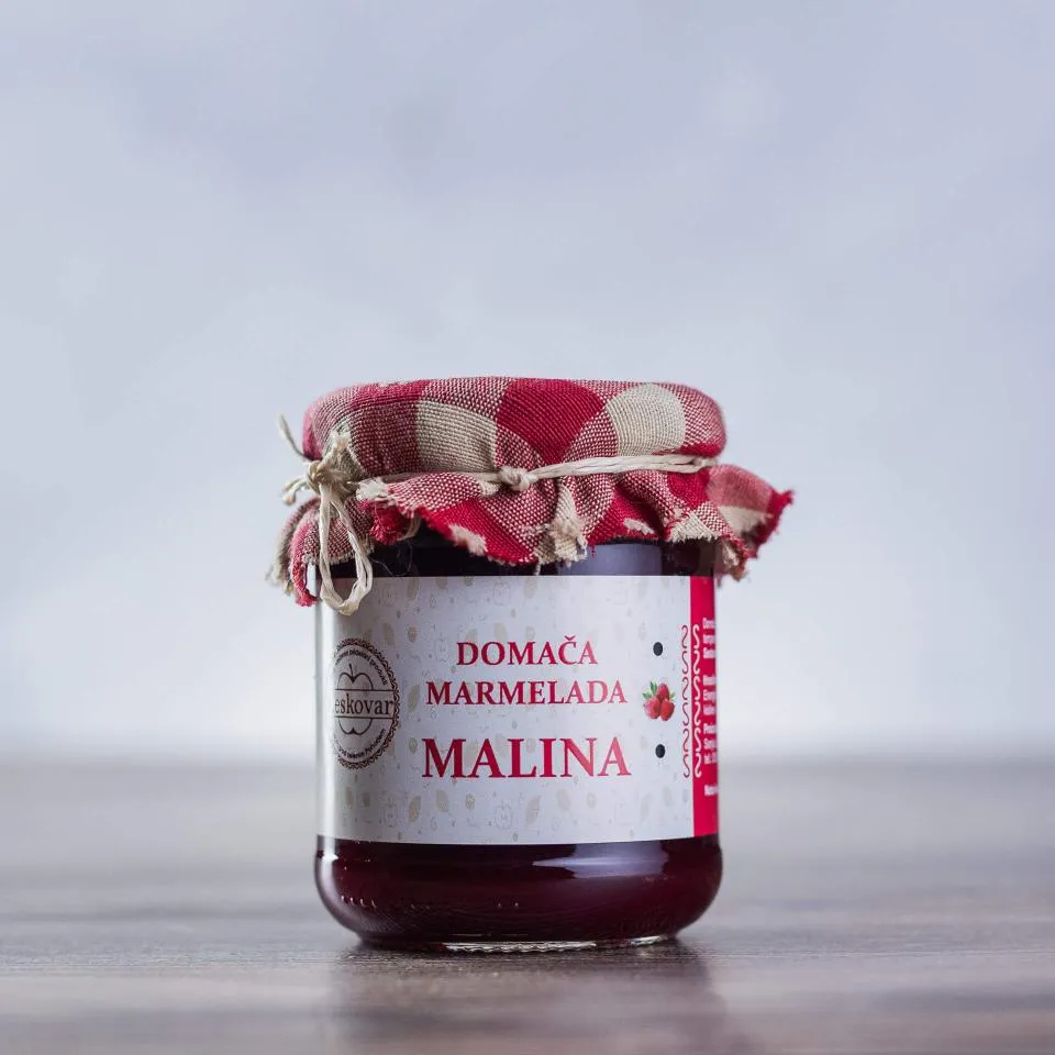 Domača marmelada iz malin (preusmeritev v ekološko pridelavo), pridelanih na lastni kmetiji. Odprto hranite v hladilniku pod 8 stopinj Celzija.